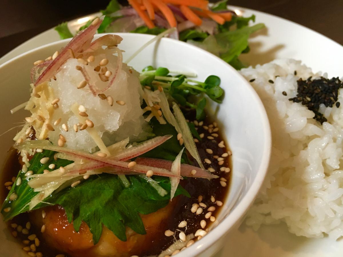 今日の日替りランチは「豆腐ハンバーグ おろしそみぞれあんのプレート」